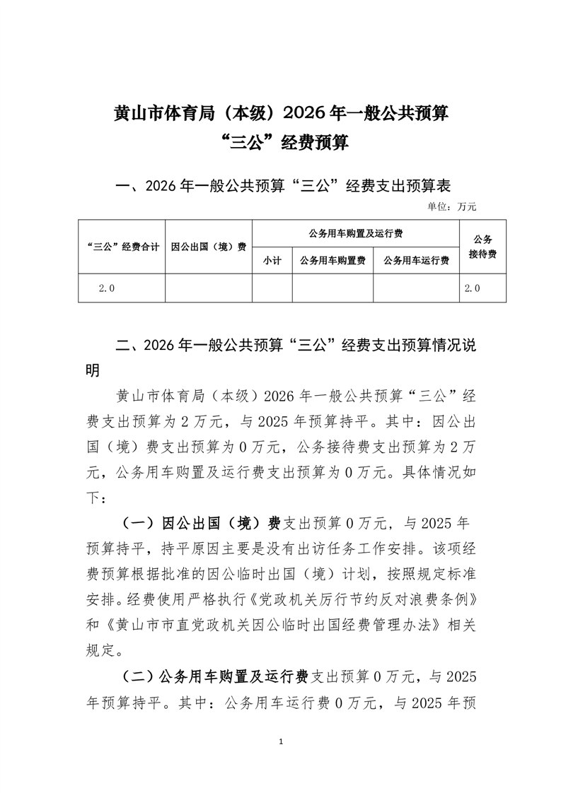 黄山市体育局(本级)2026年一般公共预算“三公”经费预算