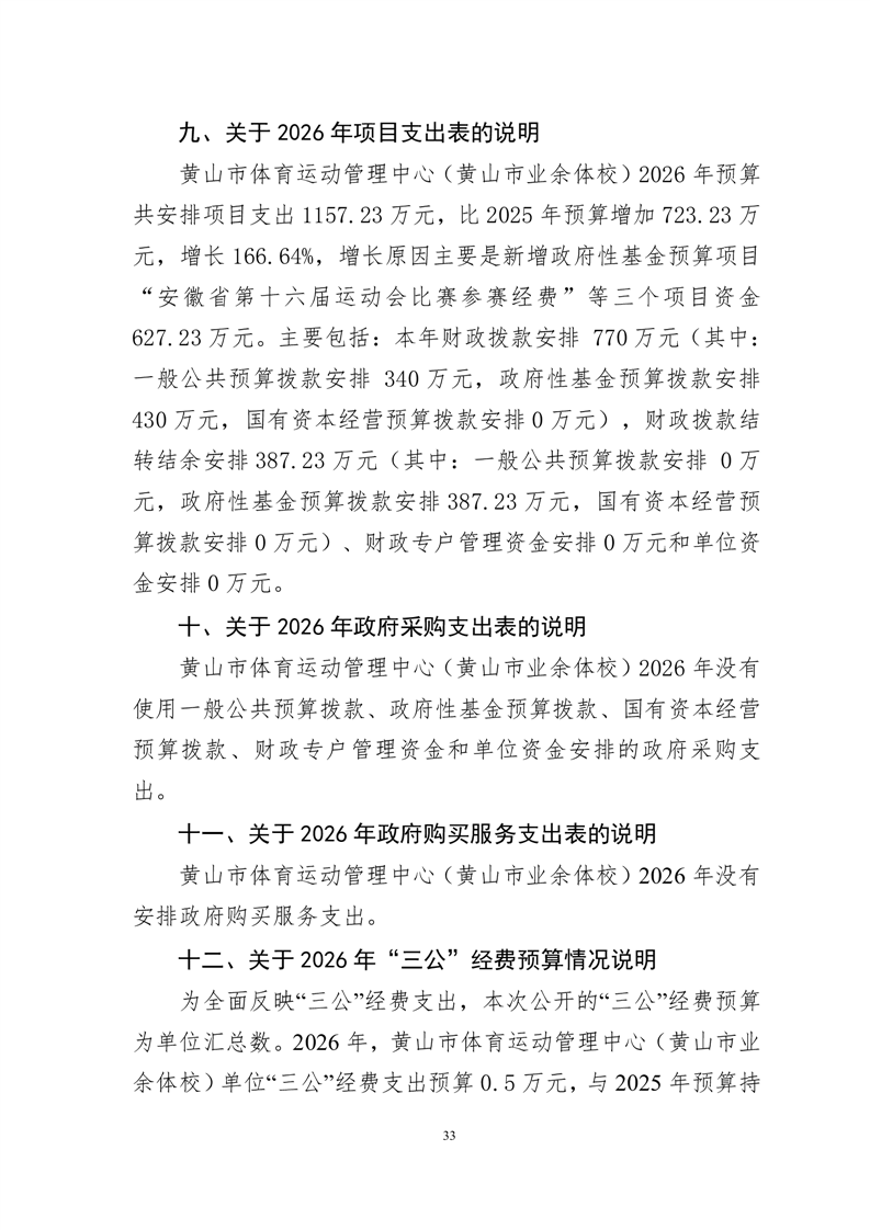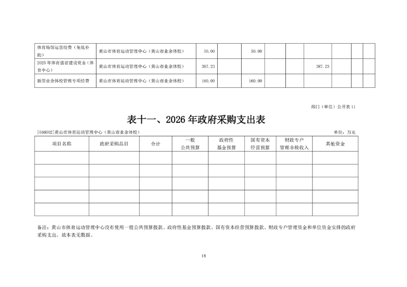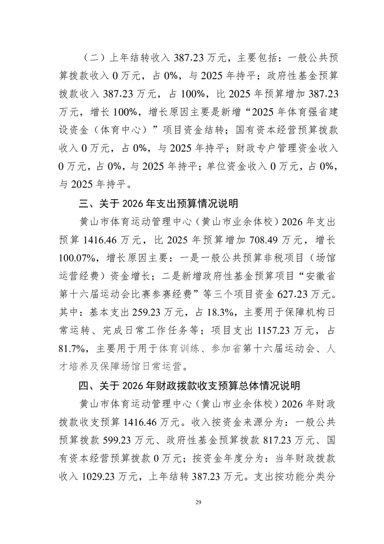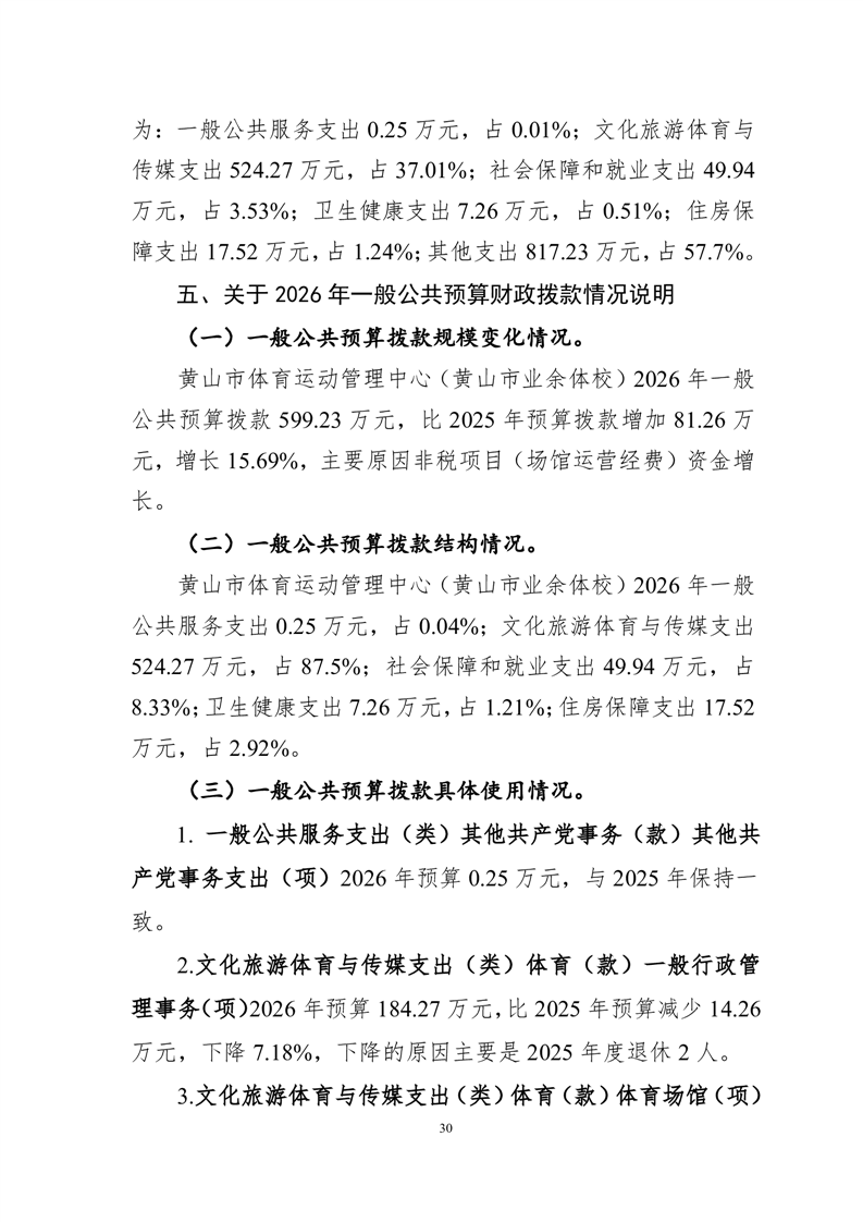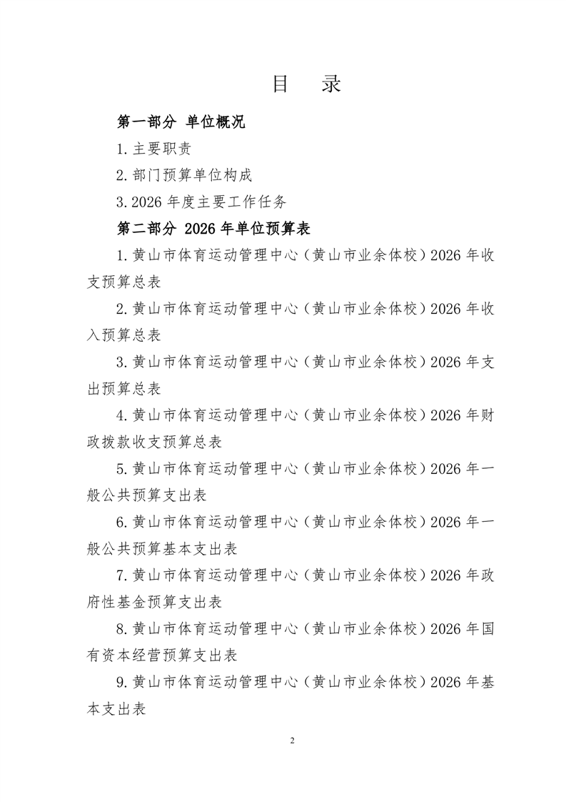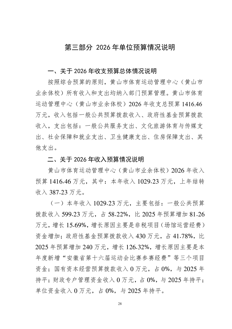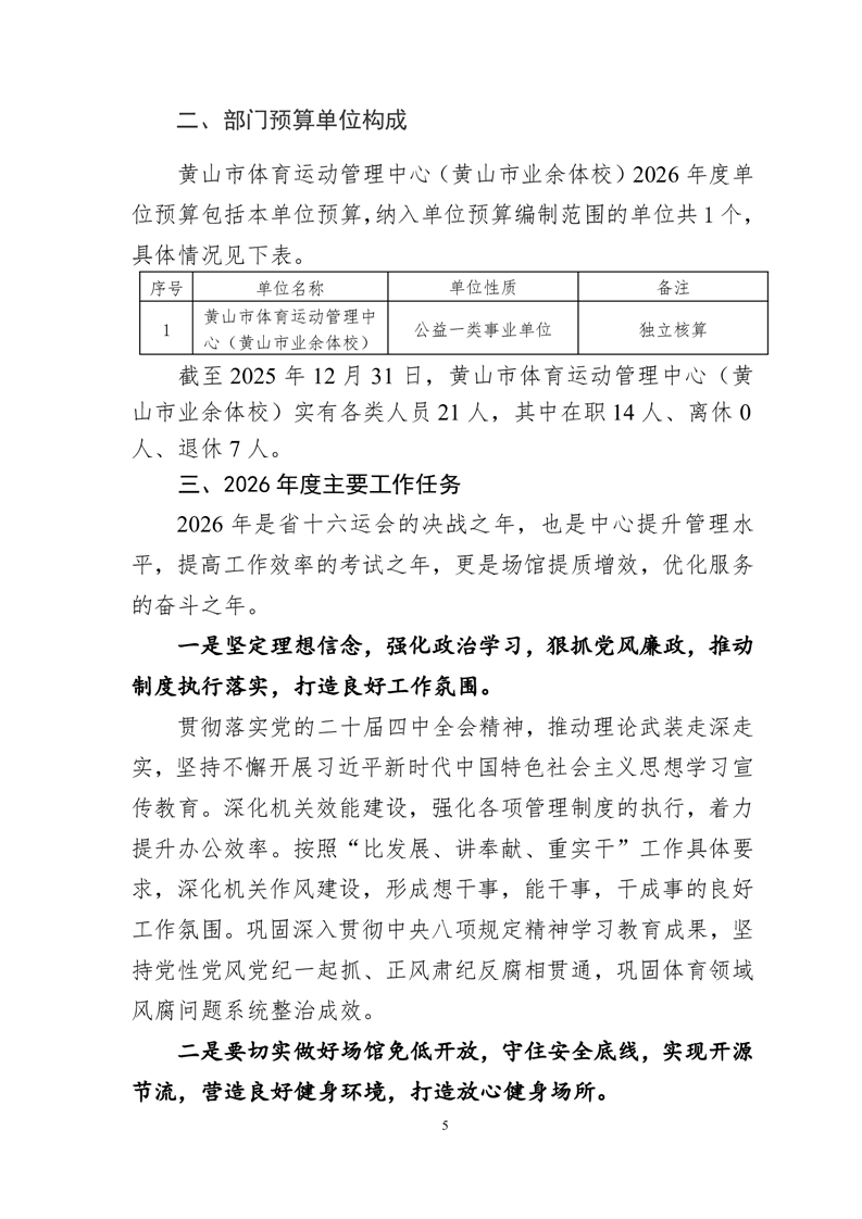 黄山市体育运动管理中心(黄山市业余体校)2026年单位预算