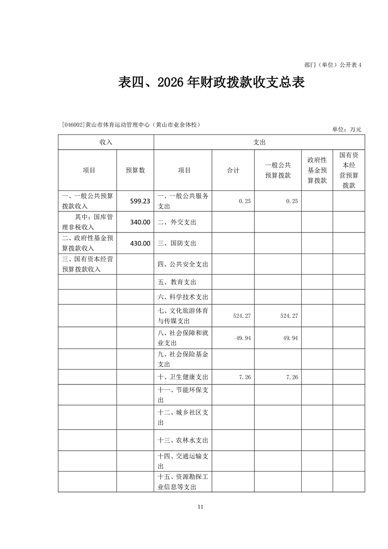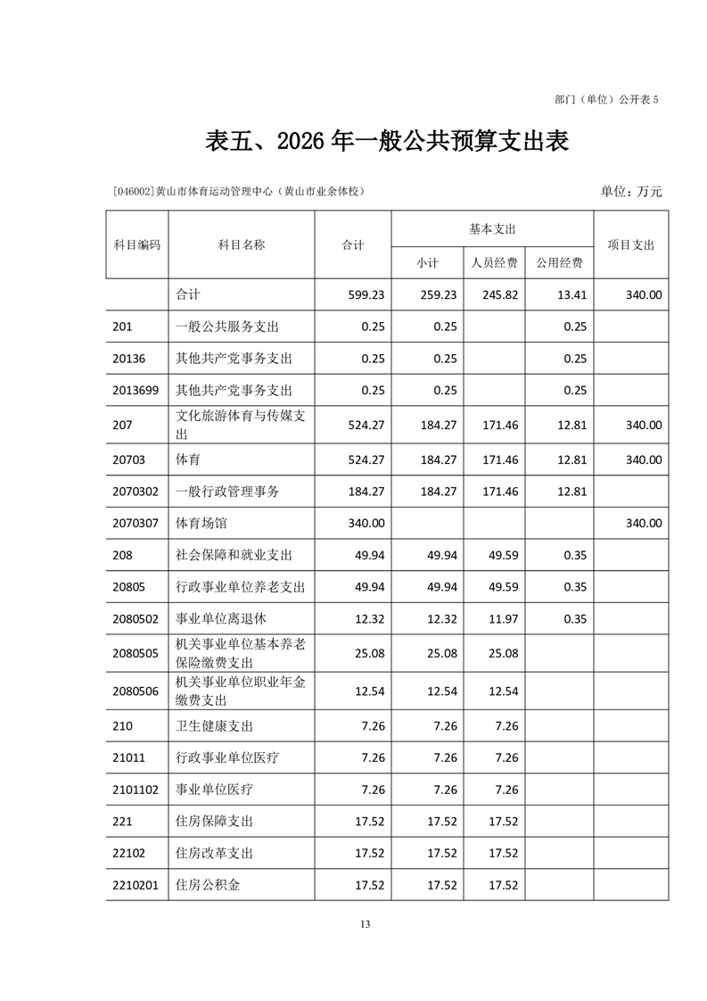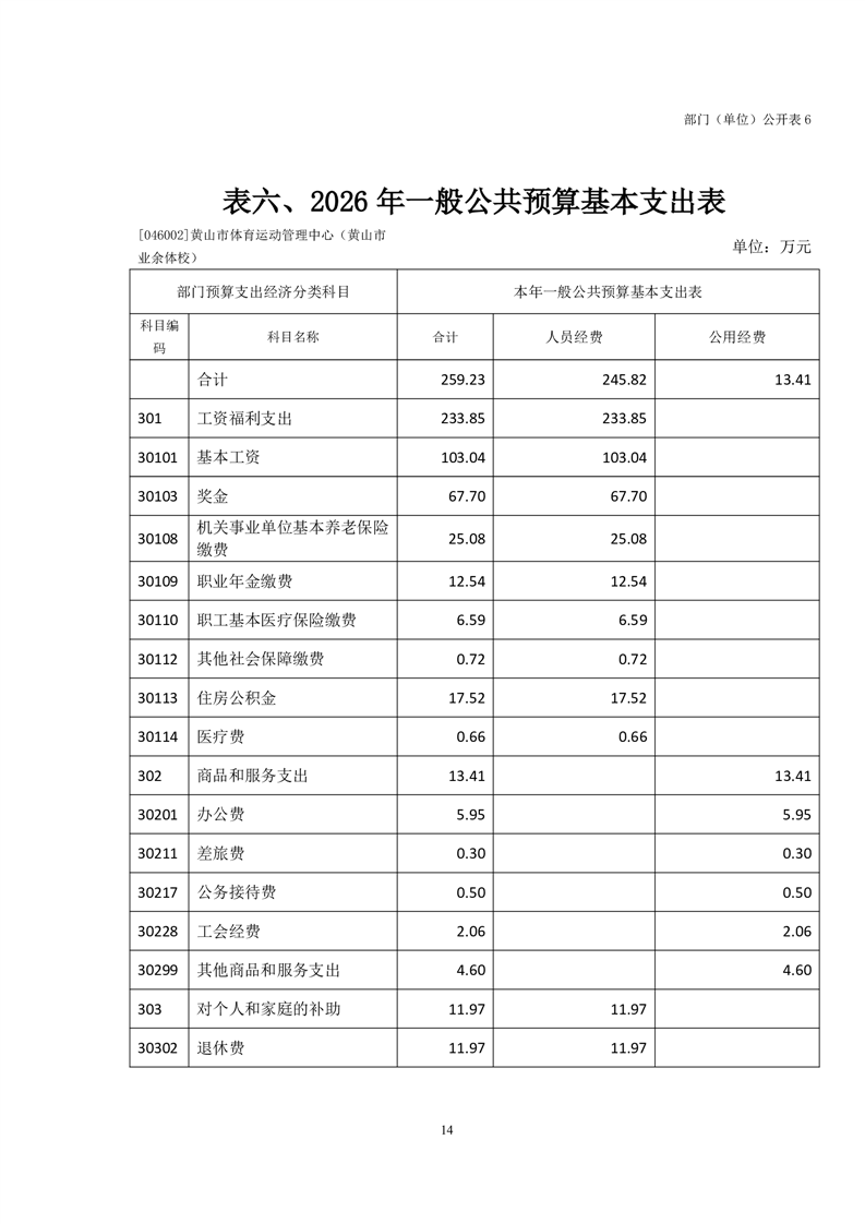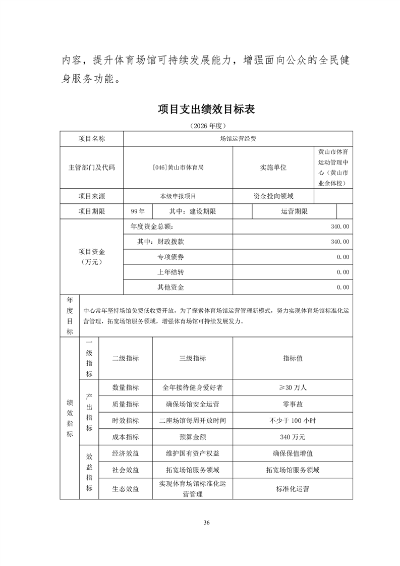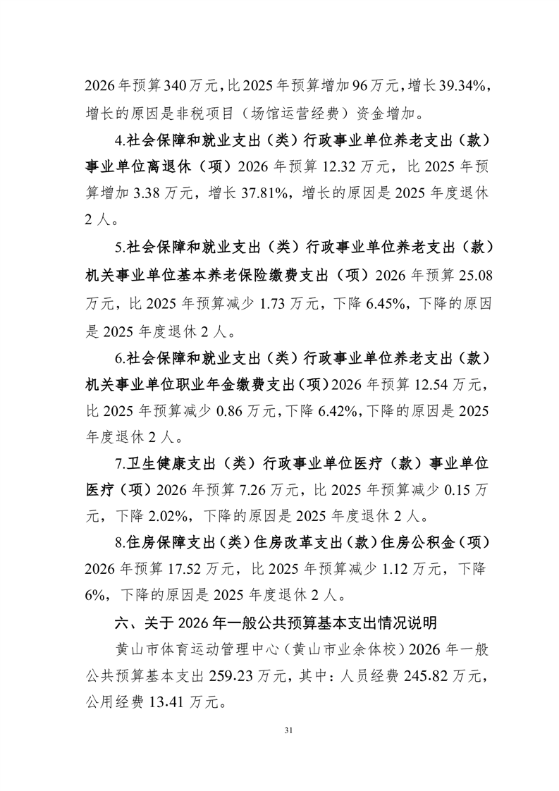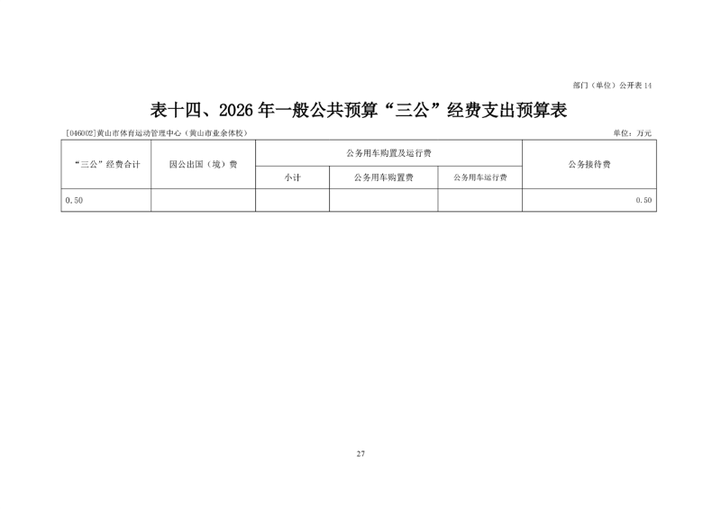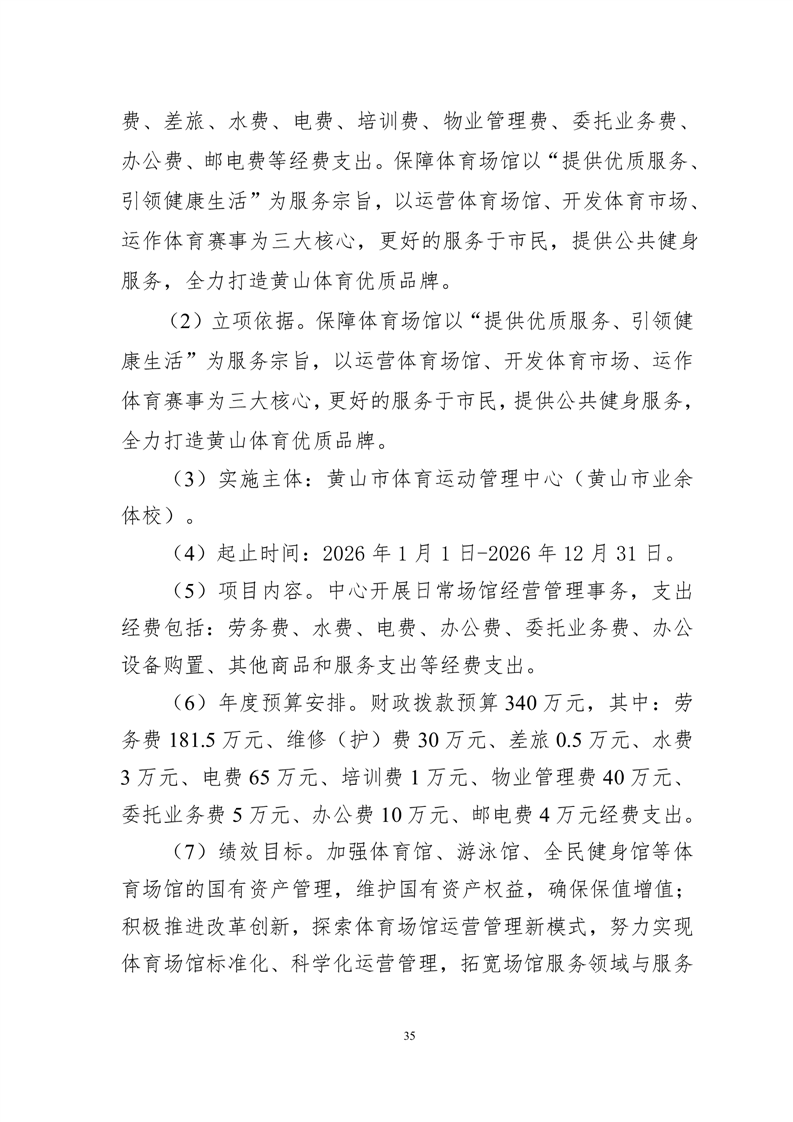 黄山市体育运动管理中心(黄山市业余体校)2026年单位预算