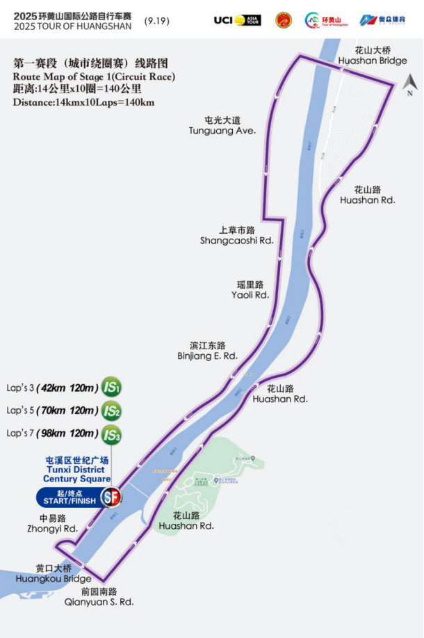 根据中国自行车运动协会委派专家组实地踏勘、复勘赛道意见,并报国际自行车联盟(UCI)同意,设计“2025环黄山国际公路自行车赛”为1日城市绕圈赛、2日公路赛,共设 3 个赛段,总里程 362公里。具体如下: