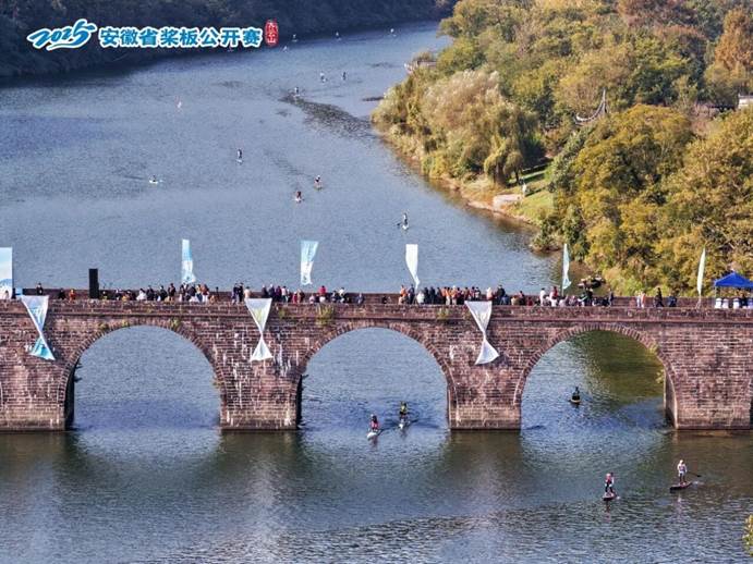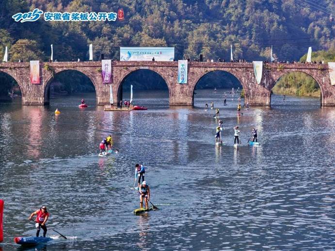 本次比赛由安徽省社会体育指导中心、安徽省社会体育指导员协会、黄山市体育总会主办,休宁县文化旅游体育局承办,安徽蓝鲸体育文化有限公司、合肥焕星体育文化发展有限公司执行。赛场选在横江齐云山段,江面水光潋滟,两岸风景如画,运动员们不仅能体验桨板运动的魅力,享受竞技比赛的乐趣,还能饱览“横江映丹霞,古桥伴云影”的诗意风光。