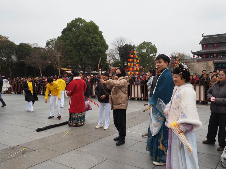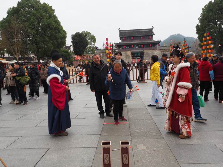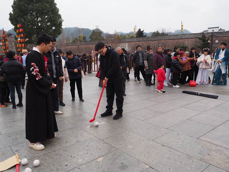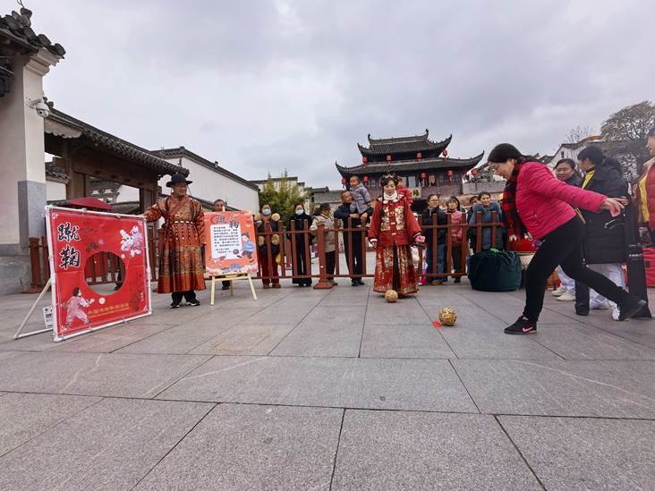 活动现场热闹非凡,在高大宏伟的徽州府衙前,蹴鞠、投壶、木射、捶丸、翔翎(鸡毛毽)、礼射(射箭)等6个古风运动项目体验区依次排开,现场早早就排起了长队。参与者有的专注瞄准箭靶,还有的围在投壶、捶丸等项目前跃跃欲试,一次次尝试、感受古人的娱乐智慧。加油声、欢笑声此起彼伏,古色古香的冬日古城仿佛被这股热络的年味点燃。