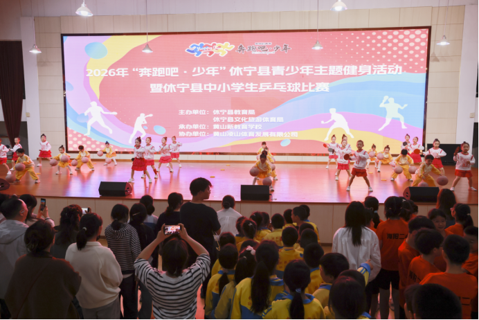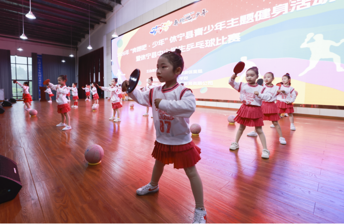 赛事聚焦体教融合,全县中小学生挥拍竞技,展现出新时代青少年昂扬向上的运动风采。闭幕式上,休宁县中心幼 儿园教育集团城南分园的小朋友们带来了融合乒乓球与篮球的特色节目,活力满满,为赛事添彩。